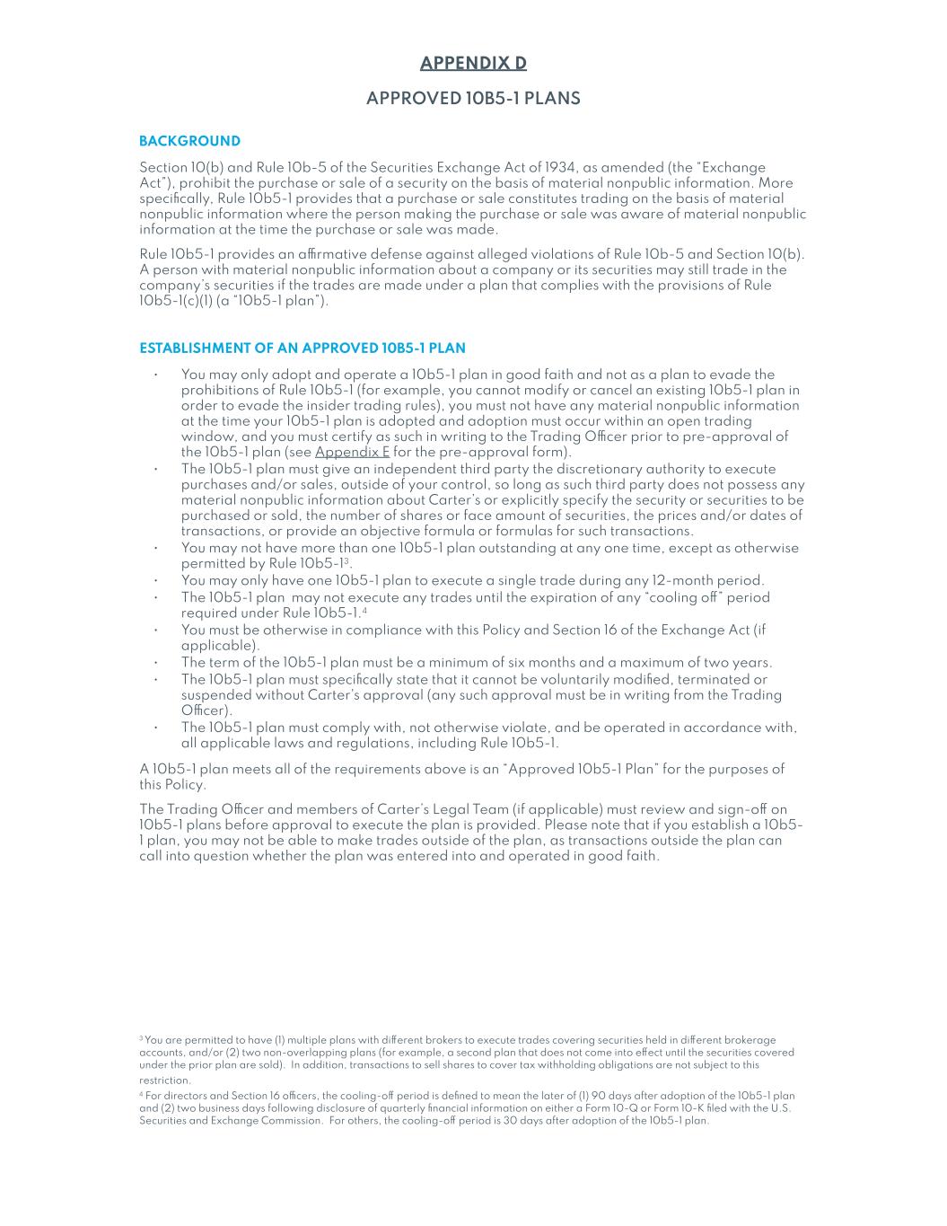 | 10.1.4 | | Amendment No. 4 to Fourth Amended and Restated Credit Agreement and Second Amendment to Amended and Restated Security Agreement, dated as of April 11, 2022 (this “Amendment No. 4”), relating to (i) the Fourth Amended and Restated Credit Agreement dated as of August 25, 2017, among The William Carter Company, a Massachusetts corporation (the “U.S. Borrower”), The Genuine Canadian Corp., an Ontario corporation (the “Canadian Borrower”), Carter’s Holdings B.V., having its official seat (statutaire zetel) in Amsterdam, the Netherlands, registered with the Dutch trade register under number 63530201 (“Dutch Borrower” and, together with the U.S. Borrower and the Canadian Borrower, the “Borrowers”), each lender from time to time party thereto (collectively, the “Lenders” and individually, a “Lender”), JPMorgan Chase Bank, N.A., as Administrative Agent (in such capacity, the “Administrative Agent”), Collateral Agent (in such capacity, the “Collateral Agent”), U.S. Dollar Facility Swing Line Lender and U.S. Dollar Facility L/C Issuer, JPMorgan Chase Bank, N.A., Toronto Branch, as Canadian Agent, a Multicurrency Facility Swing Line Lender and a Multicurrency Facility L/C Issuer, J.P. Morgan SE, as European Agent, JPMorgan Chase Bank, N.A., London Branch, as a Multicurrency Facility Swing Line Lender and a Multicurrency Facility L/C Issuer and the other parties party thereto | | 8-K | | 10.1 | | April 14, 2022 | | |
