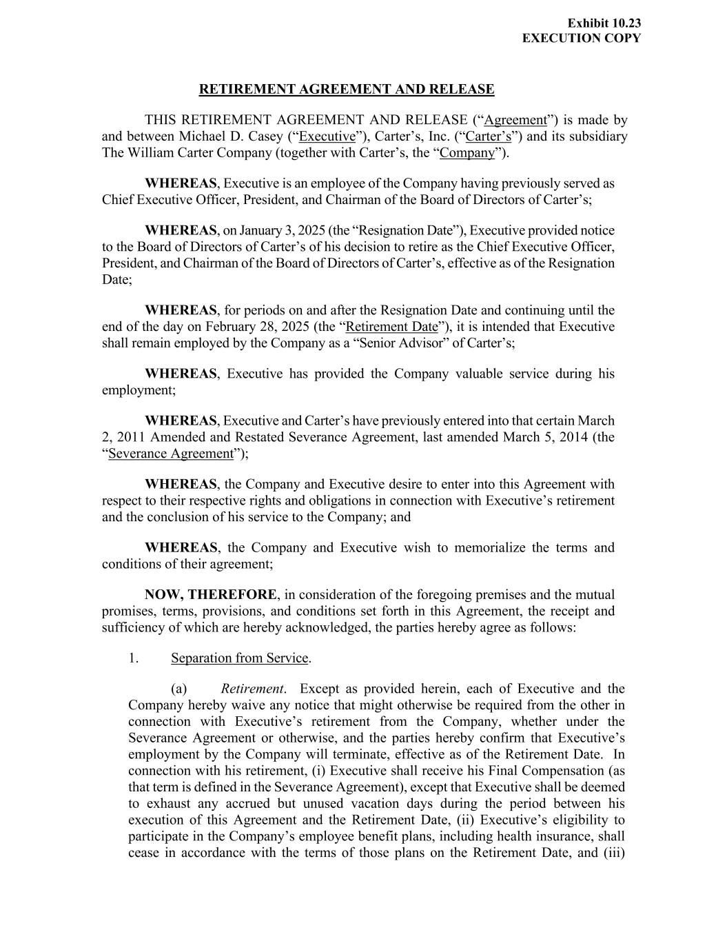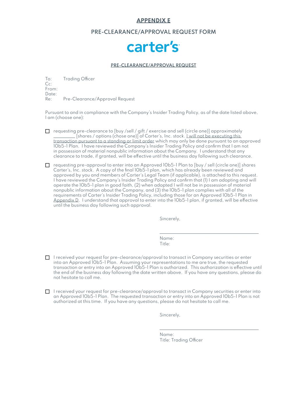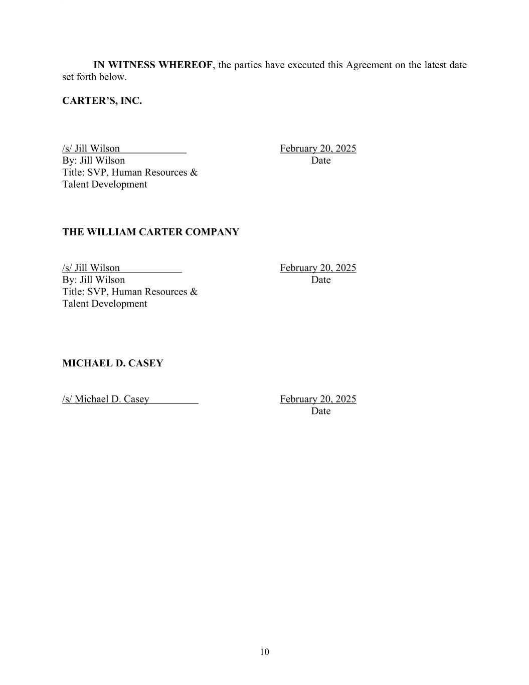 | 10.1.5 | | Amendment No. 5 to Fourth Amended and Restated Credit Agreement, dated as of June 24, 2024 (this “Amendment No. 5”), relating to the Fourth Amended and Restated Credit Agreement dated as of August 25, 2017, among The William Carter Company, a Massachusetts corporation (the “U.S. Borrower”), The Genuine Canadian Corp., an Ontario corporation (the “Canadian Borrower” and, together with the U.S. Borrower, the “Borrowers”), each lender from time to time party thereto (collectively, the “Lenders” and individually, a “Lender”), JPMorgan Chase Bank, N.A., as Administrative Agent (in such capacity, the “Administrative Agent”), Collateral Agent, U.S. Dollar Facility Swing Line Lender and U.S. Dollar Facility L/C Issuer, JPMorgan Chase Bank, N.A., Toronto Branch, as Canadian Agent (in such capacity, the “Canadian Agent”), a Multicurrency Facility Swing Line Lender and a Multicurrency Facility L/C Issuer, J.P. Morgan SE, as European Agent, JPMorgan Chase Bank, N.A., London Branch, as a Multicurrency Facility Swing Line Lender and a Multicurrency Facility L/C Issuer and the other parties party thereto | | 10-Q | | 10.1 | | July 26, 2014 | | |