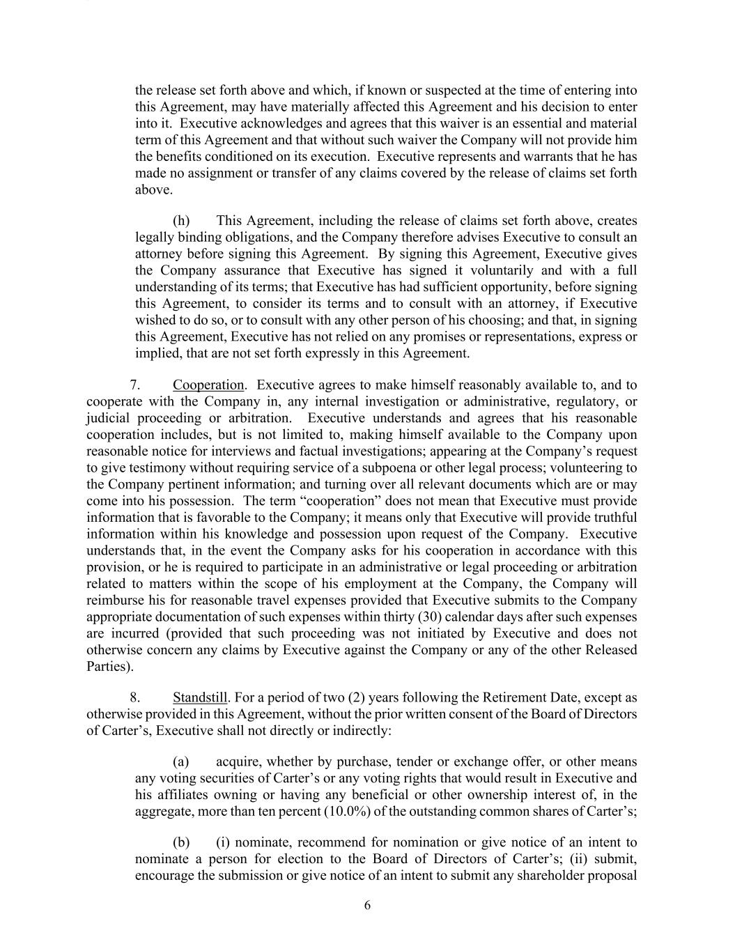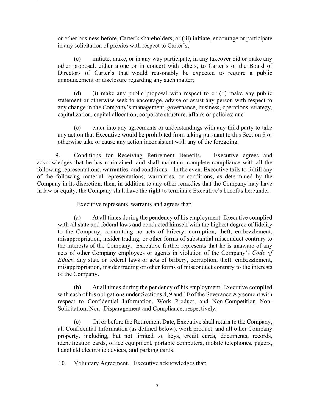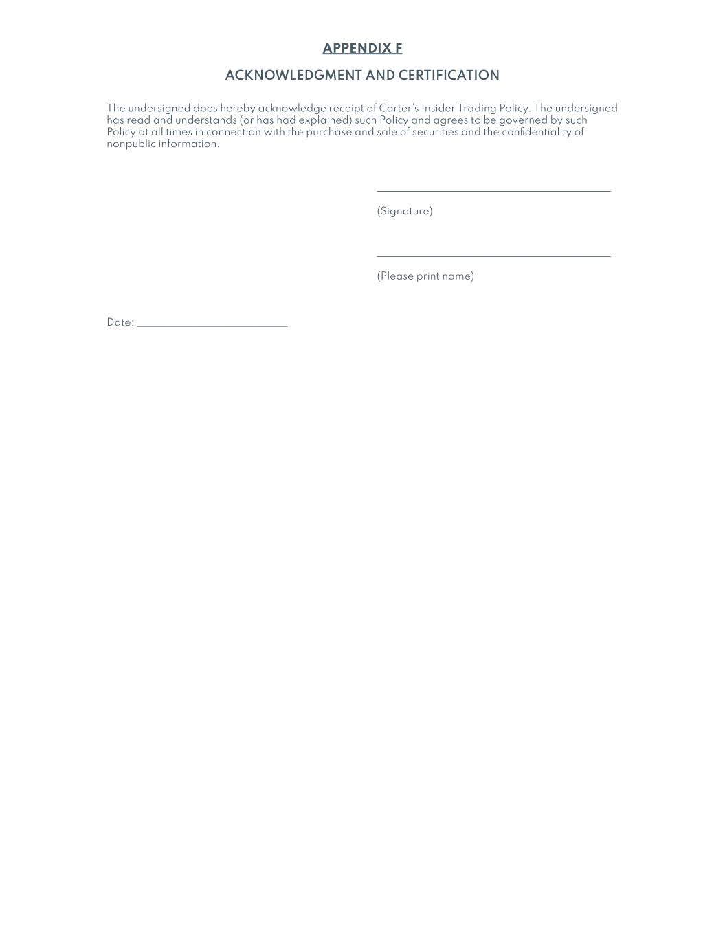 | 10.1.5 | | Amendment No. 5 to Fourth Amended and Restated Credit Agreement, dated as of June 24, 2024 (this “Amendment No. 5”), relating to the Fourth Amended and Restated Credit Agreement dated as of August 25, 2017, among The William Carter Company, a Massachusetts corporation (the “U.S. Borrower”), The Genuine Canadian Corp., an Ontario corporation (the “Canadian Borrower” and, together with the U.S. Borrower, the “Borrowers”), each lender from time to time party thereto (collectively, the “Lenders” and individually, a “Lender”), JPMorgan Chase Bank, N.A., as Administrative Agent (in such capacity, the “Administrative Agent”), Collateral Agent, U.S. Dollar Facility Swing Line Lender and U.S. Dollar Facility L/C Issuer, JPMorgan Chase Bank, N.A., Toronto Branch, as Canadian Agent (in such capacity, the “Canadian Agent”), a Multicurrency Facility Swing Line Lender and a Multicurrency Facility L/C Issuer, J.P. Morgan SE, as European Agent, JPMorgan Chase Bank, N.A., London Branch, as a Multicurrency Facility Swing Line Lender and a Multicurrency Facility L/C Issuer and the other parties party thereto | | 10-Q | | 10.1 | | July 26, 2014 | | |